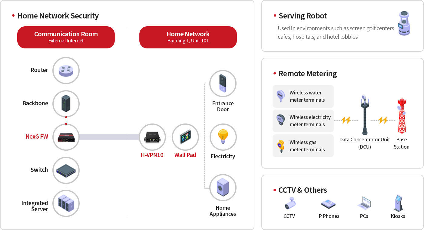 Supports a wide range of IoT environments including home networks, serving robots, remote metering, and CCTV. Ensures reliability with dual AC&DC power, power locking, and heat sinks. VPN technology provides network isolation between households, encrypted data transmission, integrity protection, critical data security, and mutual authentication, meeting all home network security requirements. Hardware and software-based solutions can be optionally provided depending on the environment.